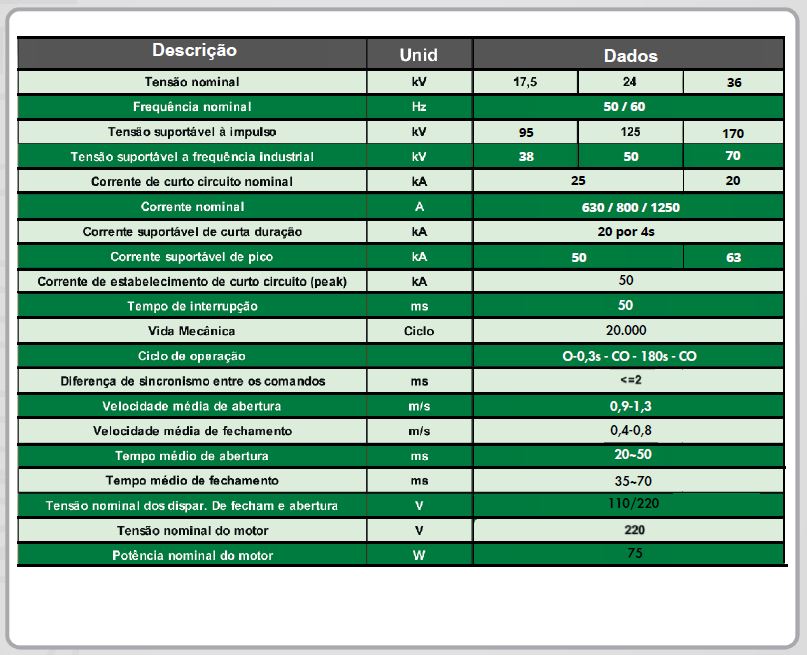 O tempo de interrupção é de 50 ms e o disjuntor apresenta vida mecânica de 20.000 ciclos. O ciclo de operação é O-0,3s-CO-180s-CO, com sincronismo ≤2 ms.