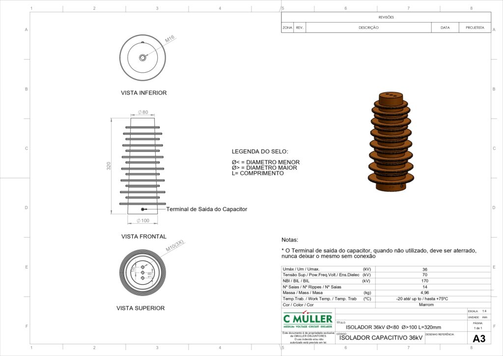 Possui comprimento de 320 mm, diâmetro menor de 80 mm e maior de 100 mm, com 14 saias para aumento da distância de escoamento. Suporta tensão de ensaio em frequência industrial de 70 kV e apresenta BIL de 170 kV. Opera em temperaturas de -20 °C a +75 °C, com massa aproximada de 5,18 kg e acabamento na cor marrom.